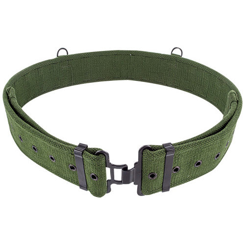 This heavy duty 58 pattern olive green webbing belt is a load carrying belt and will fit waist sizes up to 42" (132cm length). This 58 pattern belt is canvas material, which unlike a lot of its imitators that are made of nylon, does not slip around. The loop size is 50mm and the rear features two D rings for attachments, plus metal re-enforced eyelets, slide adjusters and a robust male-to-female metal front fastening.