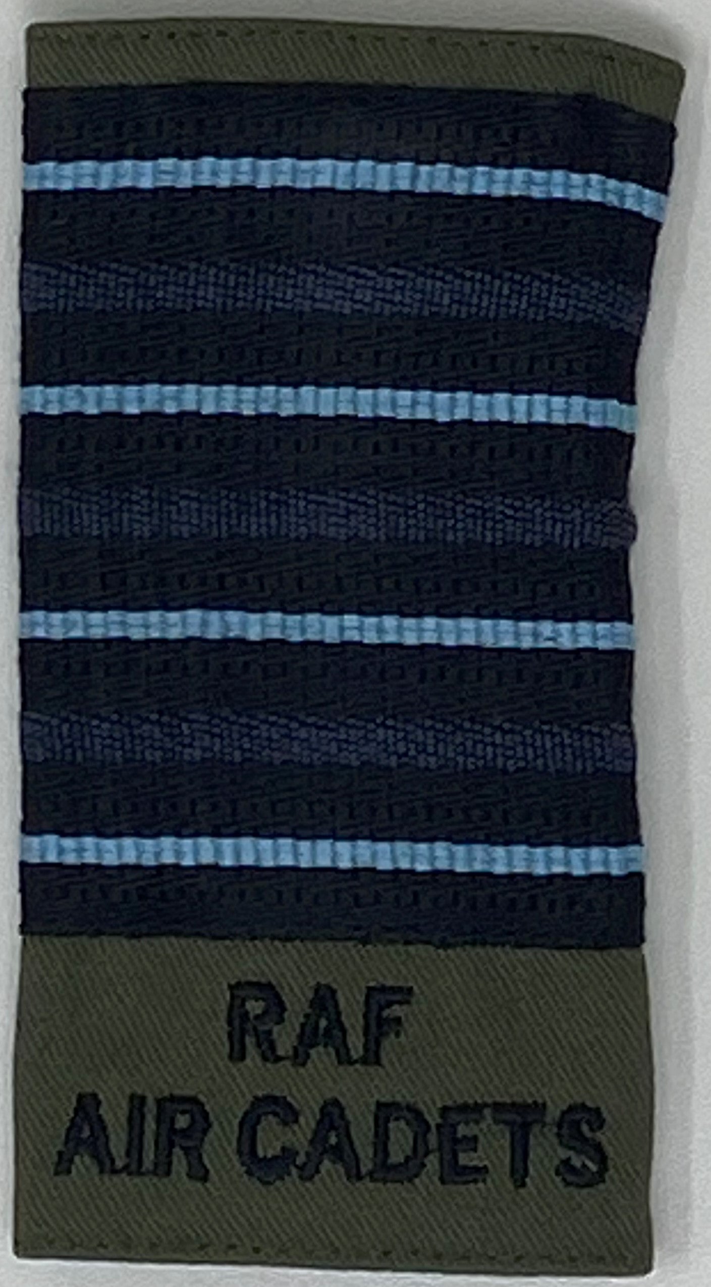RAF Air Cadets Officers Olive Rank Slides for use on No2 dress. Sewn with regulation officers braid onto regulation RAF Olive. To be worn on No2 dress – RAF V or Crew Neck Jersey. Available as Pilot Officer, Flying Officer, Flight Lieutenant, Squadron Leader and Wing Commander.